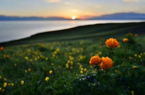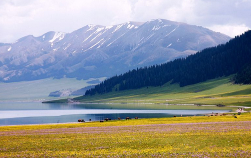 “蓝蓝的天空,青青的湖水,绿绿的草原……”6月,走进赛里木湖,置身腾格尔《天堂》里传唱的草原仙境,感受了赛里木湖六月的醉人美景和迷人风采。蓝天、白云、绿草、黄花,每一种颜色都有着那种几近原始的高纯度,边歌边泳的天鹅、嬉戏觅食的野鸭、几匹健壮的骏马、几群如云的绵羊。在这方空灵的世界里,人、动物、大自然相处的是那样和谐,以至于每一个来到这里的人,都会情不自禁的喊上几声,唱上一曲,从心地里萌生出对造物主神奇物化本领的崇敬。