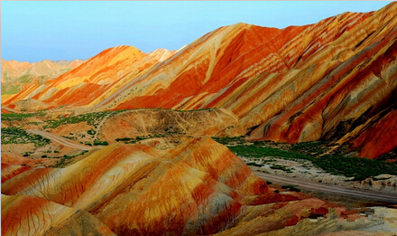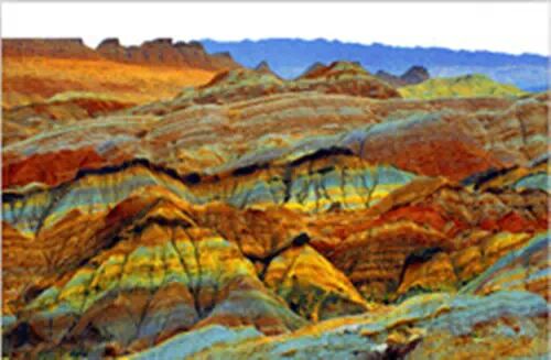 张掖的丹霞地貌,如用文字来表达,仅有两个字——震撼。其气势之磅礴、场面之壮观、造型之奇特、色彩之斑斓,大自然的鬼斧神工,令人惊叹。它不仅具有一般丹霞的奇、险,而且更美的在于色。在方圆10多平方公里的范围内,随处可见有红、黄、橙、绿、白、青灰、灰黑、灰白等多种鲜艳的色彩,把无数沟、山丘装点得绚丽多姿。张掖丹霞地貌以她那层理交错的线条、色彩斑斓的色调、灿烂夺目的壮美画图,形成一个彩色的童话世界。