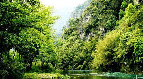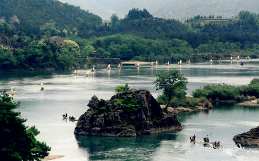 初夏游楠溪江别有一种情致,满目的绿从山峦之间一直层层叠叠地蔓延到溪边水畔,将溪水浸染成明明暗暗的青碧色。楠溪江的水域地图,看上去就像一片摊开的桑叶,皱巴,起伏不平,不规则的边际。凸起的地方是山,在山的每个缝隙,都有曲折的水流,细致如丝,像叶子上的茎脉,弯曲,在反反复复的弧线中展开自己优雅的长度。在那些粗细不等的茎脉边上,散布着无数个圆点,像桑叶上透气的毛孔,每一个圆点都是心驰神往的古老村落。